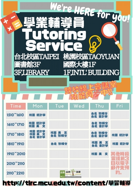 詳細各科輔導時間請詳見附件圖檔,線上諮詢服務請至教資中心網頁查詢http://tlrc.mcu.edu.tw/zh-hant/content/%E5%AD%B8%E7%BF%92%E8%BC%94%E5%B0%8E