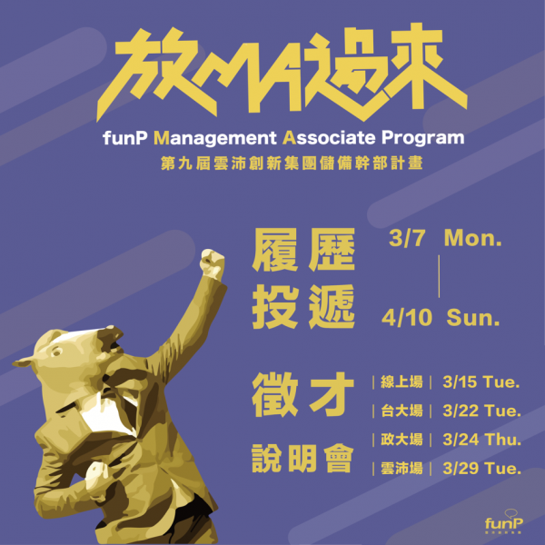 funP 儲備幹部徵才計畫 funP Management Associate Program 已於 3/7 開放申請,誠摯的歡迎優秀的同學及校友加入!